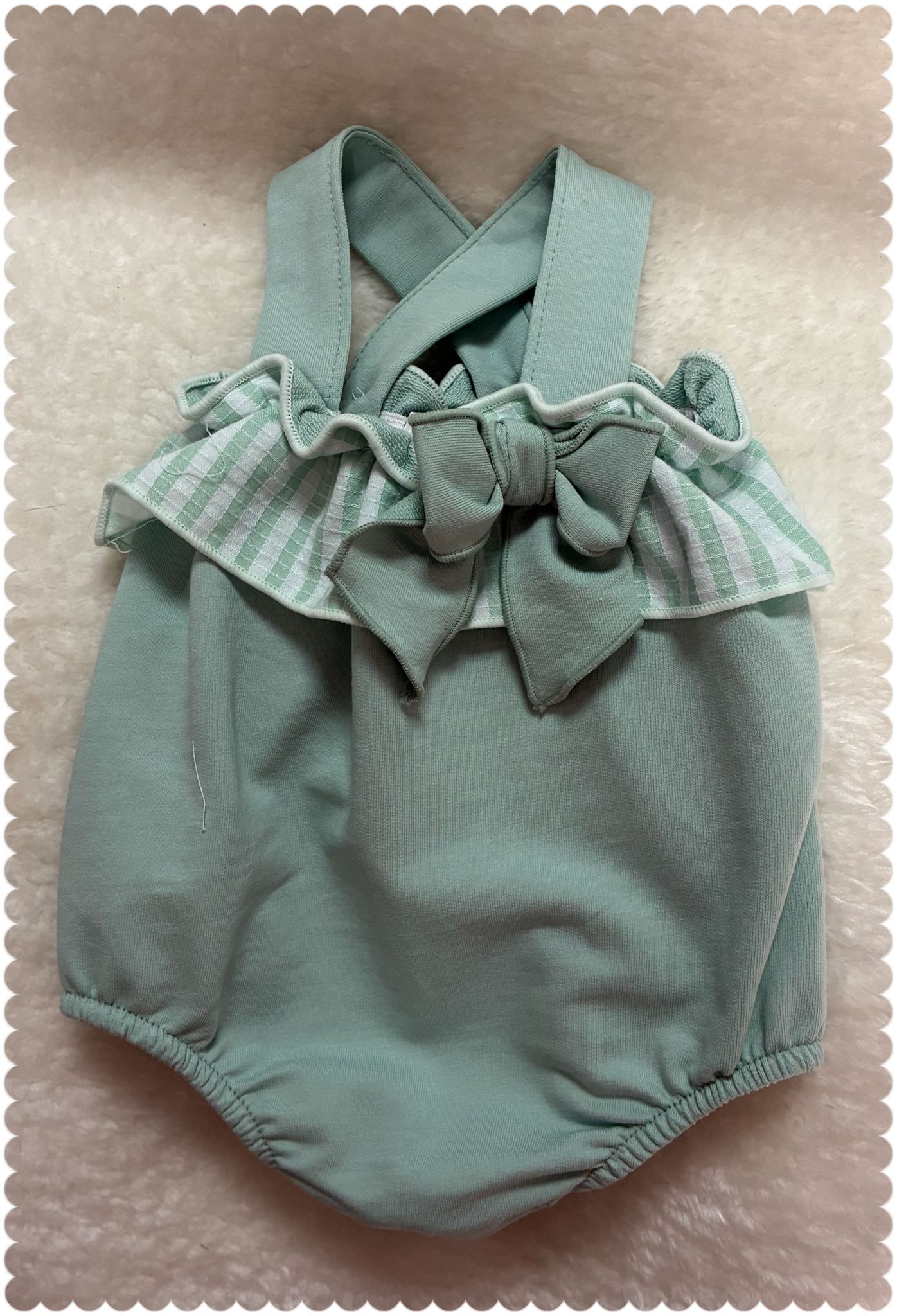 Peto de niña ,va bicolor , verde en algodon liso y va combinado con tela a rayas verdes. Tambien lleva de adorno un lazo en el laterar