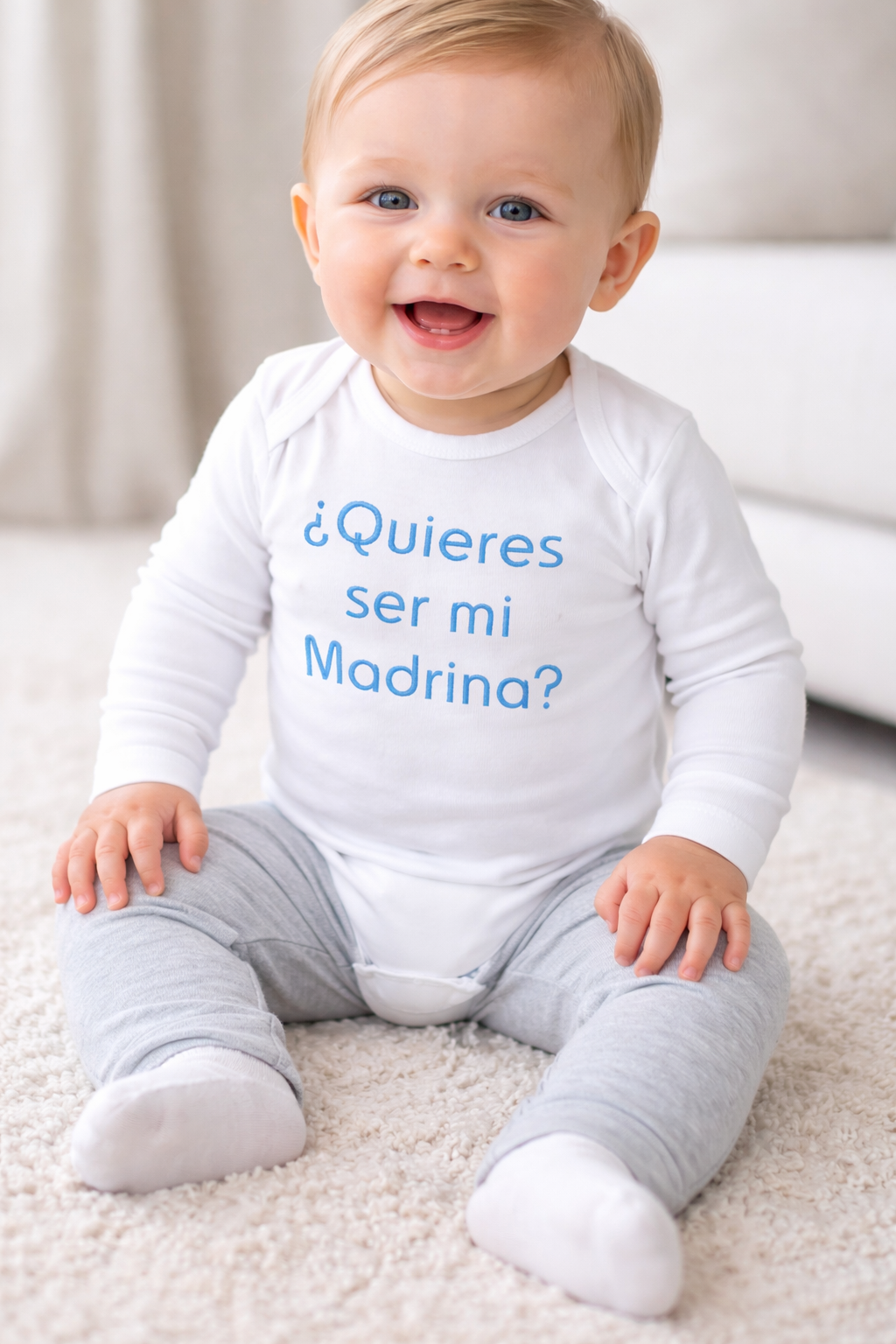 1. Body bordado , con frase de quieres ser madrina o mis padrinos . Color a elejir