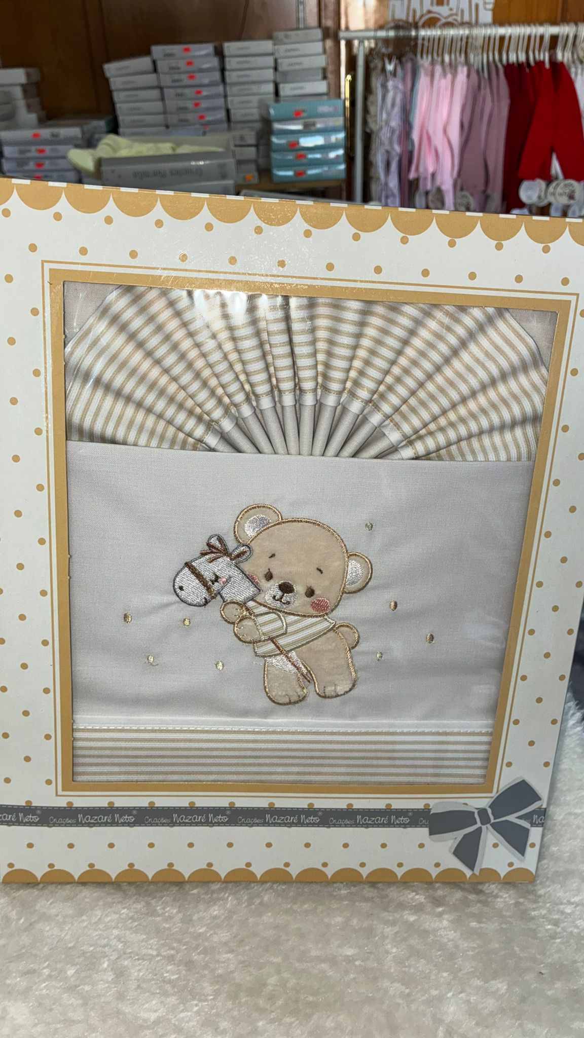 Conjunto de cuna de tres piezas, bajera , almohada y encimera .Sabana 100X160 ,Ajustable 60×120,Almohada 30X50 .De algodon